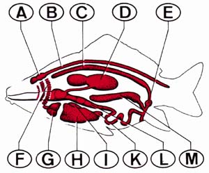 (a): Gehirn (b): Hauptnervenstrang (Rückenmark) (c): Niere (d): Schwimmblase (e): Harnblase (f): Kiemen (g): Herz (h): Leber (i): Galle (k): Milz (l): Darm (m): Geschlechtsorgane |